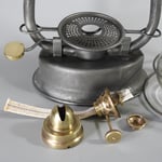 This is a very rare Albert Frank Lantern. I already owned the etched Kaiser Globe by Albert Frank and now it has the proper home. The lantern had been dropped at one point in its life so the air tubes have pushed down into the top of the fuel tank. This can not be fixed without risking damaging the entire lantern so it remains as it is.