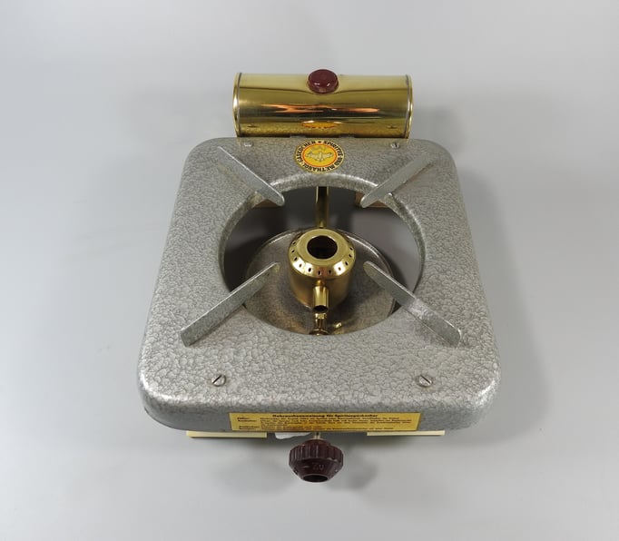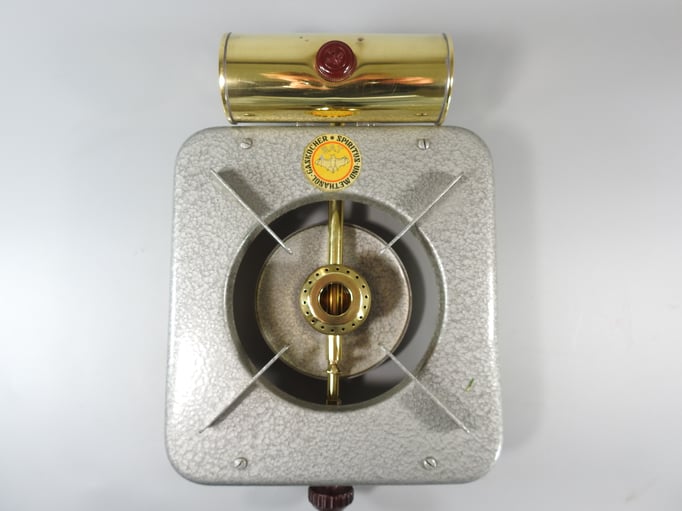 This Bat stove runs on denatured alcohol like any other Spiritus Stove. It is in excellent condition. The Bat emblem is on both ends of the brass tank plus on the fuel cap on the top of the tank. The original Bat sticker is still in place on the top of the stove. This stove has all brass components for the burner.
