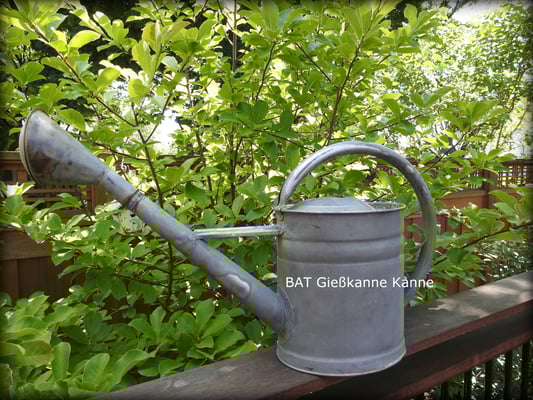 This is a vintage 'Bat' Brand Zink watering can. It is embossed with the Bat Logo and also '10LDIN'. This stands for 10 Liter DIN. (Deutsches Institut für Normung e.V. (DIN; in English, the German Institute for Standardization) is the German national organization for standardization)