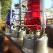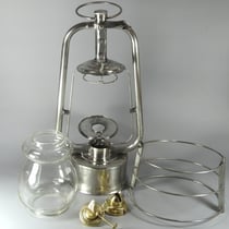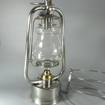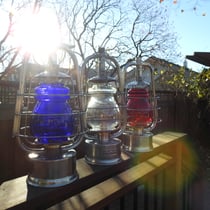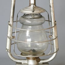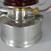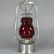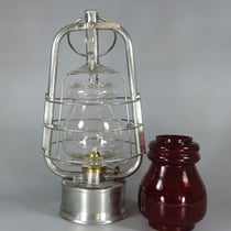 The clear Helvetia globe is original to the lantern. The plain red globe was a later add to the lantern (what you see in the photo gallery).