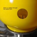 Cased glass is a method which involves blowing a new color inside of a piece that has already been created. Another process entails layering different colored glasses over each other. In each technique, the multiple layers of glasses are fused and blown out together to form the cased glass. A wheel cutter would have been used for the 'peep hole'. When viewing through the peep hole, it lines up perfectly with the wick coming from the Burner.