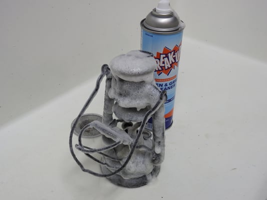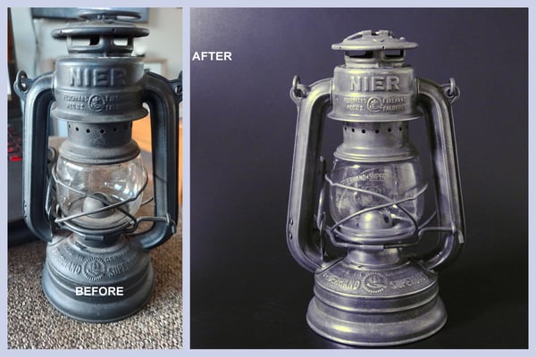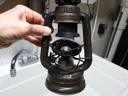 This lantern came to me painted black which at a glance, didn't look too bad. From past experience, I knew that the black paint was hiding the rust which also was preventing the burner from coming out of the insert. Once stripped, it revealed an extremely solid Feuerhand. No pin holes or leaks.