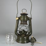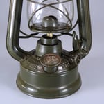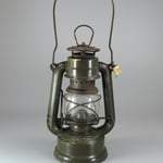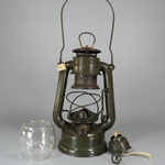 All of the paint (RAL 6006 matte) is original and there was no indication (rust) that this lantern had been left and/or used outside. The chimney is in poor condition due to heavy use and the lantern slightly leans.