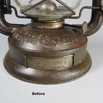 This lantern came to me with an interesting history. It had been stored away in a barn near Peggy's Cove in Nova Scotia. The elderly owner at that time was serving up Lobster's at Joe's Best Lobster shack. He indicated it had been in that barn for "30 to 40" years. It now has a permanent home in my collection.