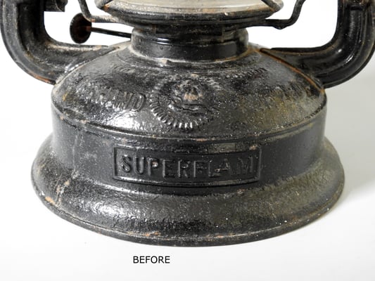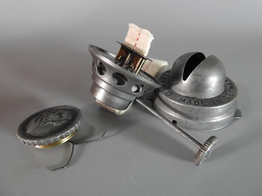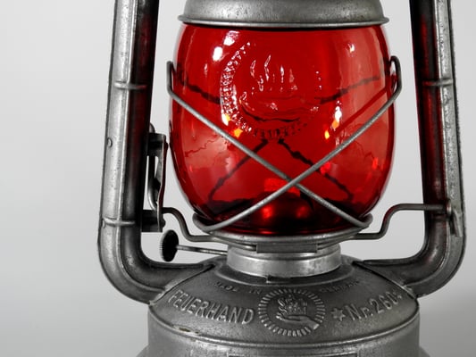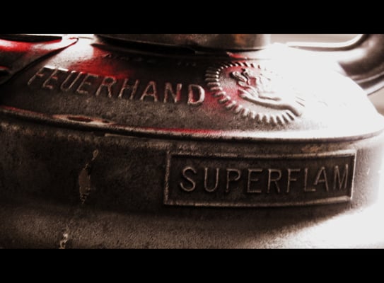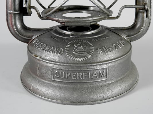 This is a rarely seen version of the Feuerhand Nr. 260. The 'Superflam' model was an export to France. This particular lantern came from Aosta, Italy. The globe that was in it when I received it was a Feuerhand Embossed 260 Globe that was clear. It now has a very rare red embossed FH Globe.