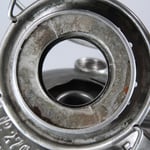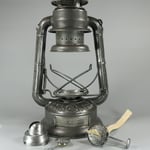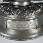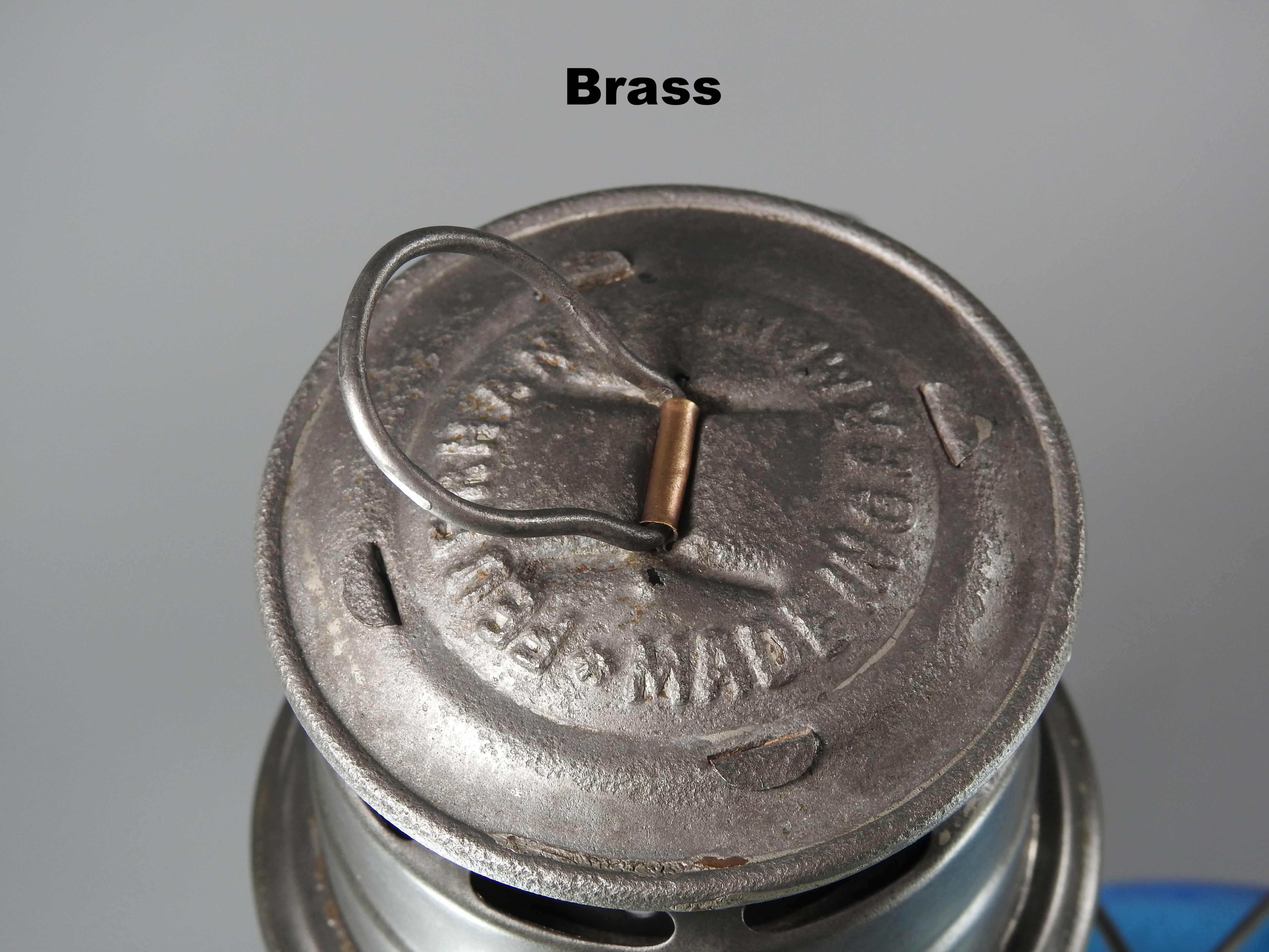 The fuel cap threads are brass and so is part of the finger lifter on the top chimney. Most interesting is that there is a 3 piece glass ring which surrounds the top of the burner cone. With many thanks to Henk Kloosterman, I was informed that the glass rings were mirrored at one time which would make the lantern flame brighter. After all these years, the silvering (the mirror) is gone.