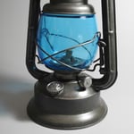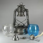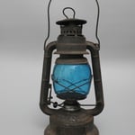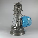 The blue globe is a rare 'WIZARD' globe. It has the religious (Hindu?) symbol of Good Luck on the globe. *Not to be confused with a 'Little Wizard' globe. It is impossible to say if this globe is original to the lantern, but it might be a safe assumption given that it is a presentation lantern.