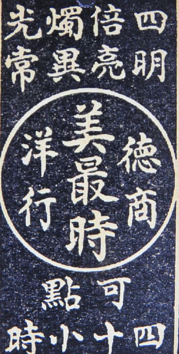 Second Translation which is very similar but more detailed. "It is a round stamp that should be rotate 90 degrees clockwise, and read vertically. It is a trademark stamp with the Chinese name for a German trading company: C. Melchers GmbH & Co. The first two characters “德商”mean “German business”, the three characters in the middle “美最時” are both the phonetic transliteration for the company name, and meaning “most beautiful time”. The last two characters “洋行” mean foreign/trading company. Still in business today, C. Melchers GmbH &Co. opened it’s first Chinese branch in Hong Kong in 1866, and a second branch in Shanghai in 1877. Subsequently the company extended its business in multiple cities in China."