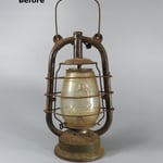 Another Frowo from Italy with the Pup Globe and pup on the Fuel Tank. The lantern was very much in need of restoration. Underneath the paint and rust was a lantern that still had most of its original tin left. The discoloration you see in the photos is from the deterioration of the tin.