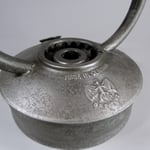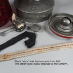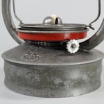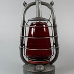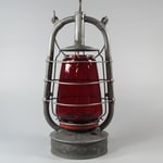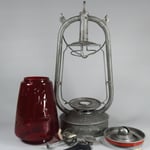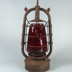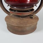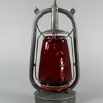 This lantern came from Bolkow, Poland. There was a fair amount of rust and some deterioration of the tinning. The original red paint on the globe tray could not be saved and it has been paint matched and repainted.
