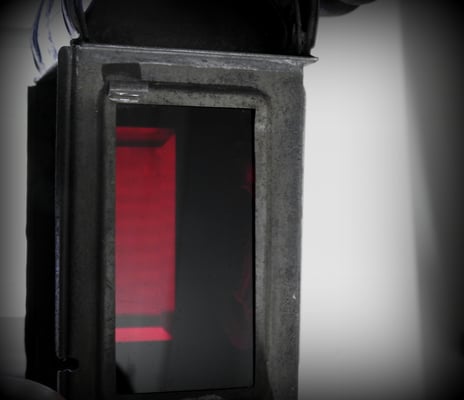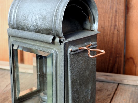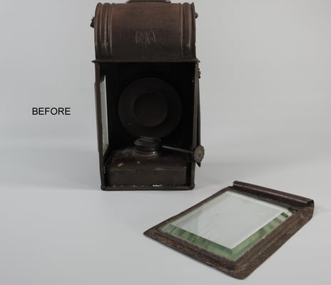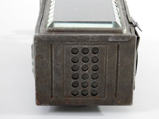 It is all original and complete except for the small sliding mechanism that holds up the tin panel on the right side. The lantern was put through the rust removal process and one coat of Museum Wax. Burner works beautifully. The beveled glass panels have a few minor scratches on them, but no cracks and intact.