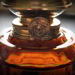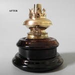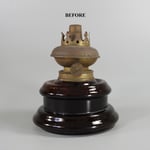 Beautiful example of a Hugo Schneider oil lamp with the 'rootbeer' colored glass and Kosmos Burner. The collar is plastered onto the glass fuel fount. This is a Photo lamp and would have had a deep dark