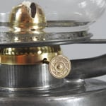 The lantern has a very old repair to the bottom of the tank. It appears the airhole, on the bottom of the fuel tank, has been soldered over. Inside the burner insert area is the air tube that would have led to the bottom of the lantern. This is typical K&T construction.