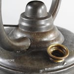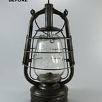 The lantern has a removal cap on top for air tube clean out; very similar to the Swiss Helvetia lanterns. At first glance it would appear that maybe this lantern should not go through the restoration process, but upon closer inspection the rust was prevalent throughout the lantern in particular near the burner insert area. Most of the surrounding tin was either missing or ready to disintegrate which it most certainly did once I pulled it out of the rust removal bath. A repair was made and is now solid and leak proof.