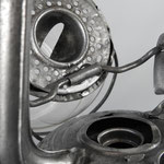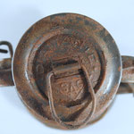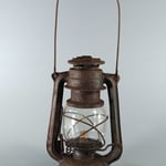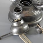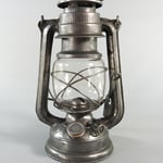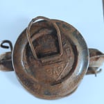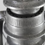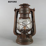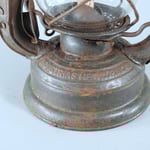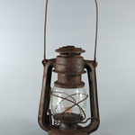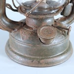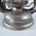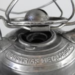 UNKNOWN MAKER. POSSIBLY MEWA (HASAG). This lantern came from Spain. On the fuel tank it is embossed 'INDUSTRIAS METALURGICAS' which translates to 'METALLURGICAL INDUSTRIES'. The original paint, which is RAL 6006, could not be saved due to the amount of rust. The burner is, if not 100%, identical to a *MEVA lantern. *NOT TO BE CONFUSED WITH 'MEWA'. MEWA did have the machines from the old Hugo Schneider factory.