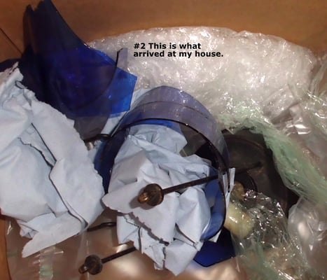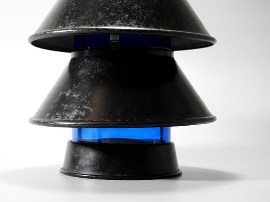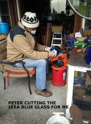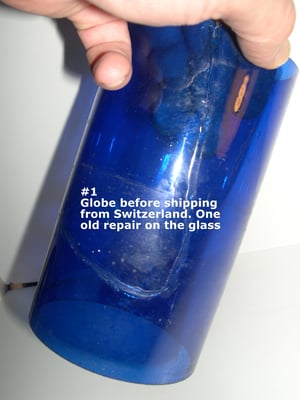 The original blue globe came broken unfortunately. It had already had a very old repair to it when it left Switzerland, but did not survive the shipping across the ocean. I was able to find a Blue Candle vase that was close in size. A very big 'Thank you' to Gwen Millard for the blue glass cylinder and to Peter Gearin, who skillfully and successfully cut the glass to the right size. It then took hours of sanding the top rim to the correct diameter so that it would fit properly.