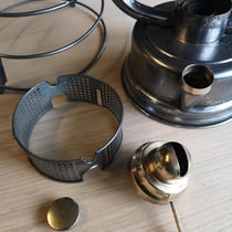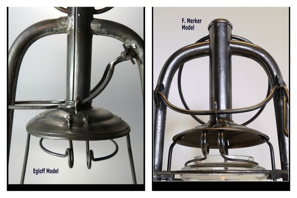 The similarities in build to F. Merker's lantern and W. Egloff's model was striking, yet when the two models are compared side by side, there are distinct differences in the the attachment of the globe lift mechanism, the shape of the fuel tank and the windscreen which goes around the burner. Both Patent registrations refer to the lifting mechanism.