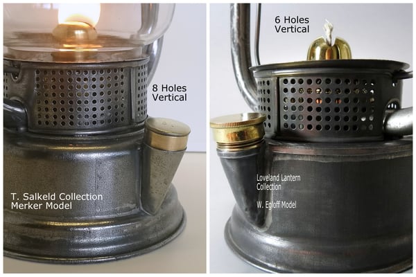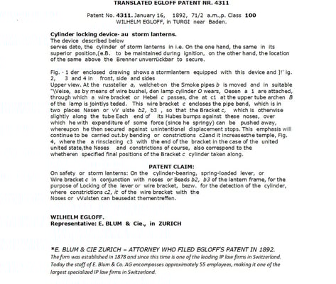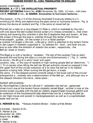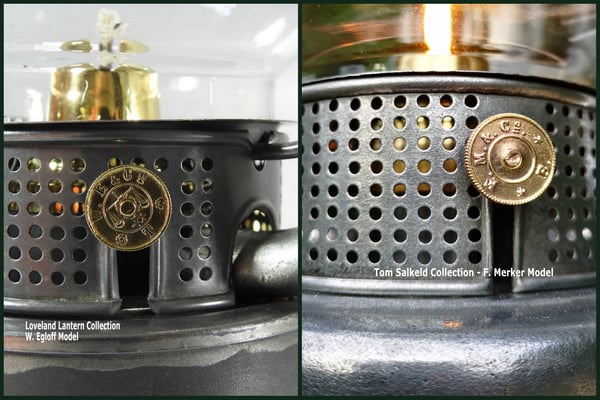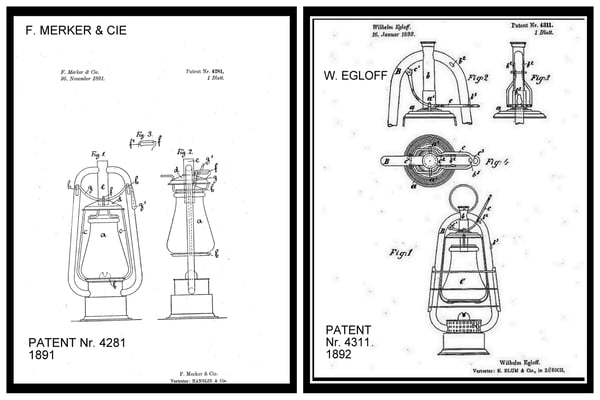 It appears (a strong possibility) that W. Egloff purchased the Patent/design from Fritz Merker approximately one year later. Egloff's Patent Nr. 4311 is dated January 16th, 1892. Egloff made and patented certain design changes to the globe lift mechanism and other characteristics to the lantern.
