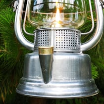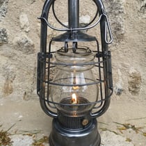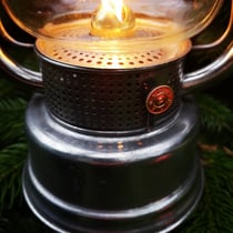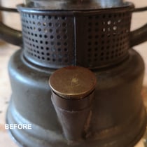 On the brass thumb wheel (wick driver) are the initials 'F.M. & Cie' and then the capital letter 'B'. These initials stand for 'Fritz Merker & Cie' and the letter stands for 'BADEN'. It is notable that that Tom's lantern still has the original burner made by Fritz Merker.